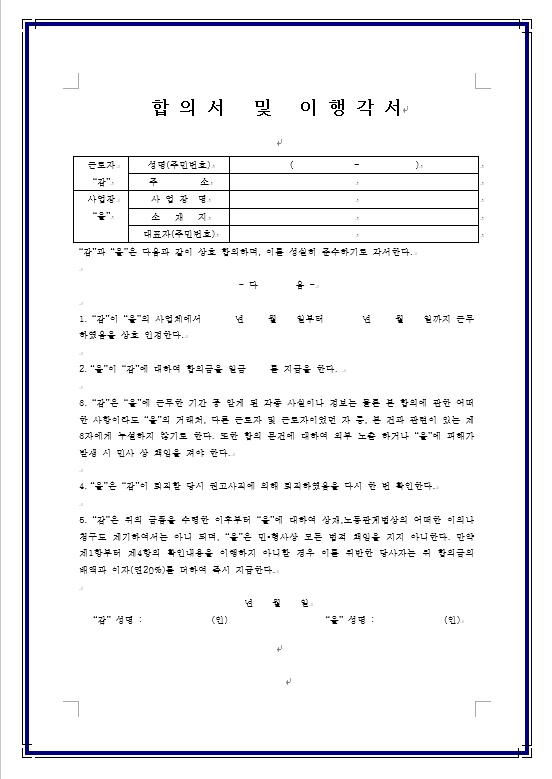 공상처리 합의서 및 이행각서, 수령증 양식입니다.
