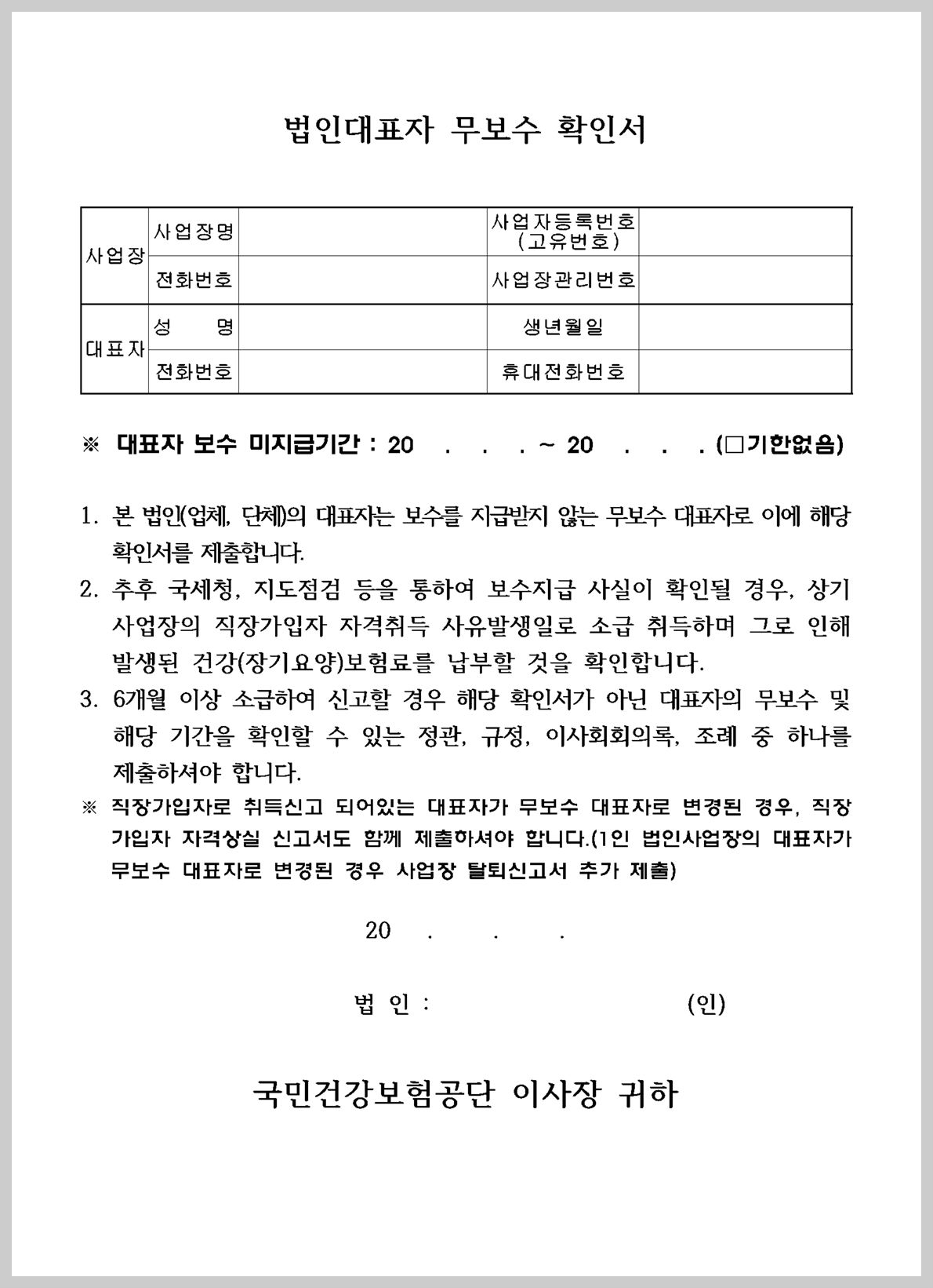 ※ 직장가입자로 취득신고 되어 있는 대표자가 무보수 대표자로 변경된 경우, 직장 가입자 자격상실 신고서도 함께 제출하셔야 합니다.(1인 법인사업장의 대표자가 무보수 대표자로 변경된 경우 사업장 탈퇴신고서 추가 제출)